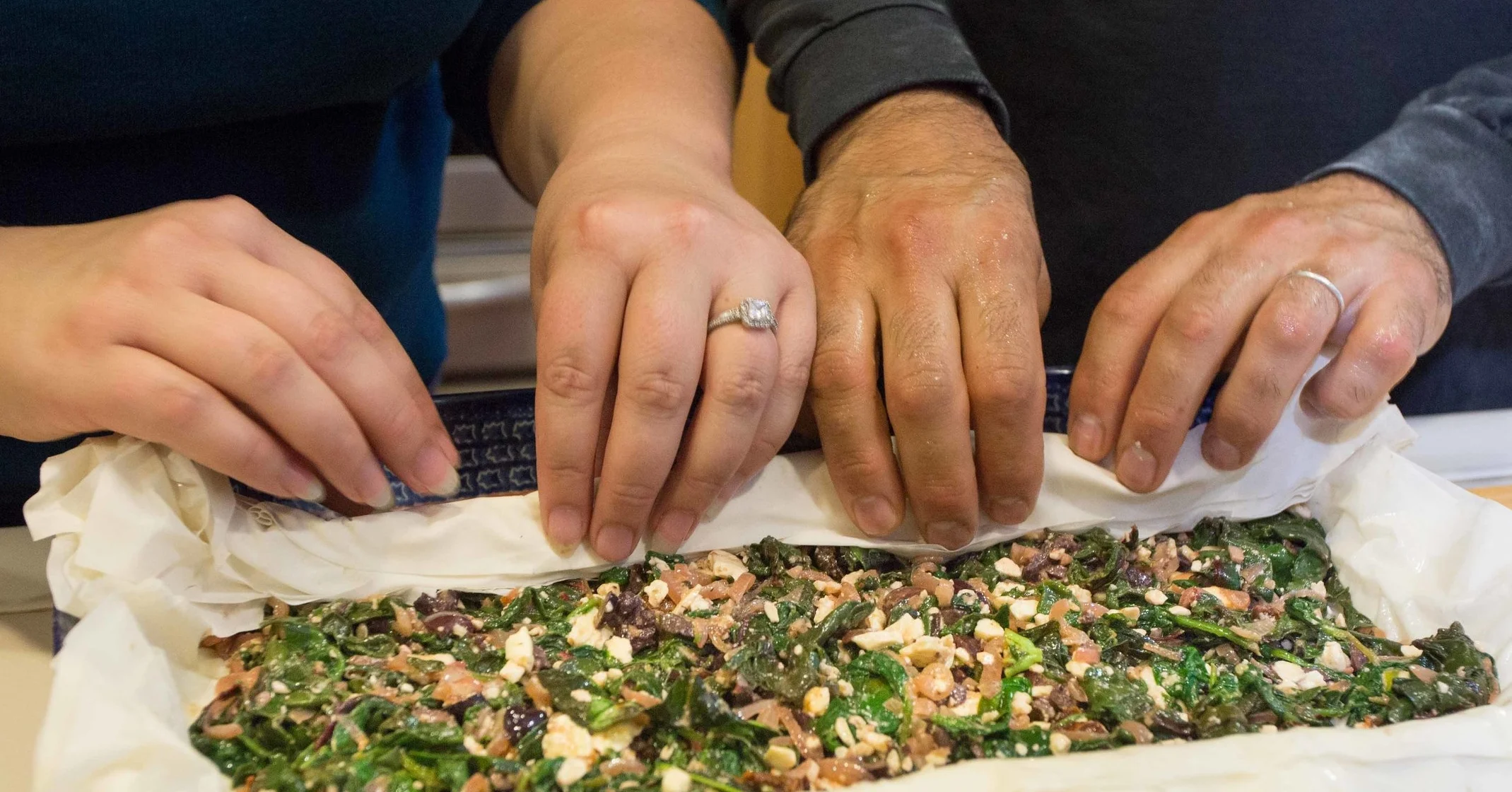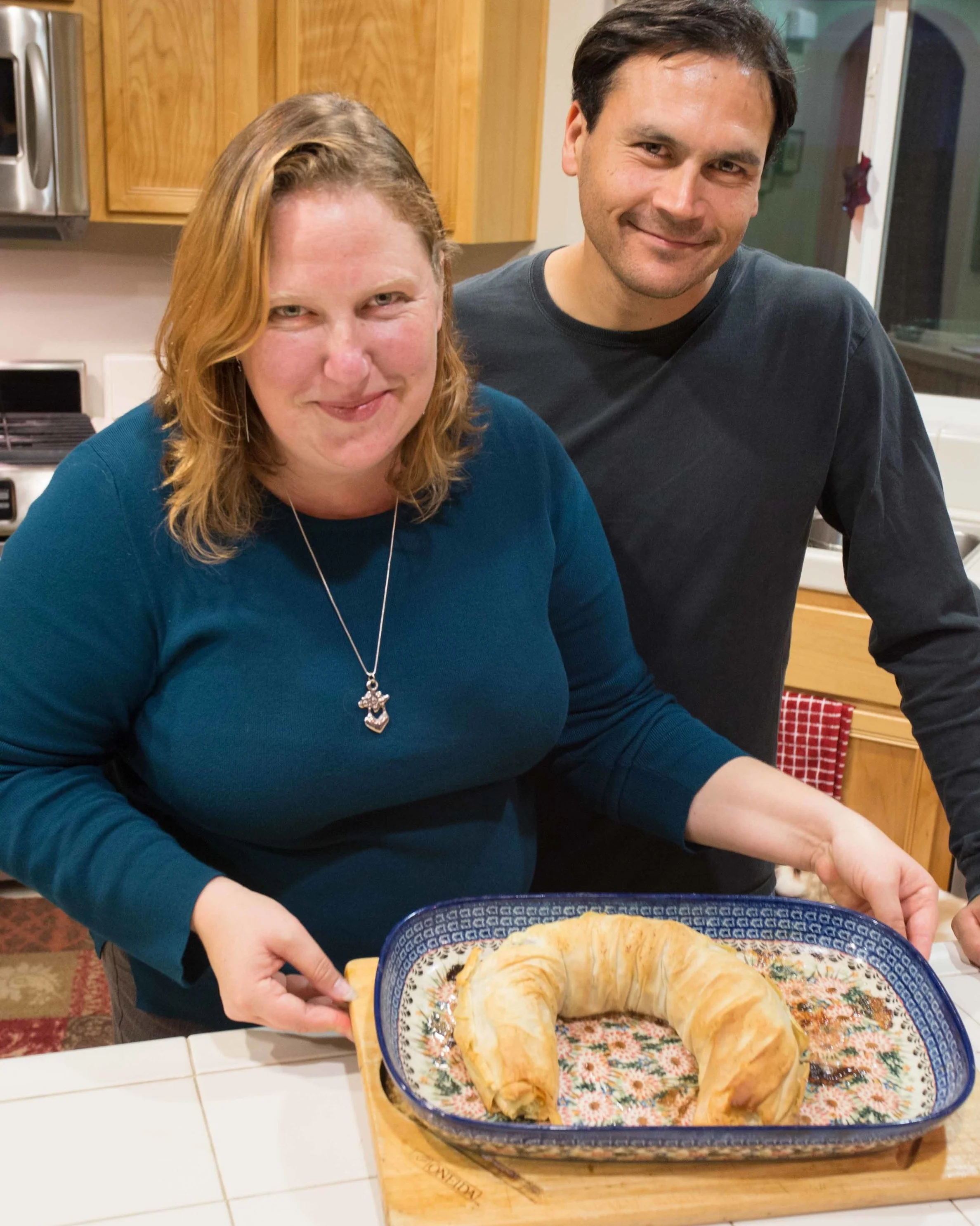 Admittedly, it was handy having four hands to layer and butter the phyllo dough. We negotiated through it and when done, we had a beautiful pastry crescent. Realizing how key communication was – and how much we would have benefitted from reading through the entire recipe together before starting – the end result seemed like an edible metaphor for the joy of a successful relationship. The finished product was delicious, impressive, and generous enough to share.