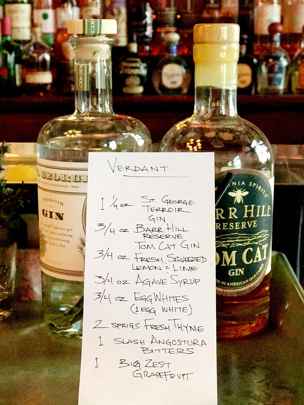 This cocktail, Verdant, is Haye’s recipe. “When I think spring time, I think of bees, I think of honey, walking in the woods, flowers.” Barr Hill Tom Cat Gin is distilled with honey, St. George Terroir Gin features coastal fir and sage, and together they create a drink that is one for the ages—just like the Golden West itself.