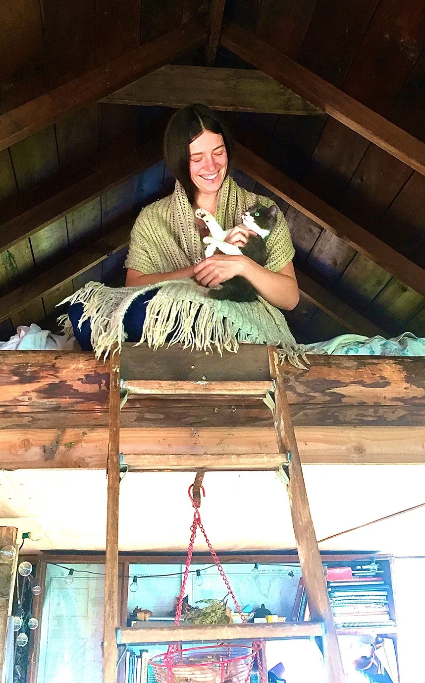 Back in Batist’s century-old cabin, I am introduced to her “puppy,” a 120-pound gray mastiff by the name of Weber. He is as sweet and gentle as he is big and leans against me for pettings. In the corner there’s a store of wool from Batist’s flock and a yarn spinning wheel. She uses an Amish Loom to weave the yarn into blankets that protect her against Caspar’s cold winds. She picks up Squeaker Bat, the cabin’s resident mouser cat, who goes docile in Batist’s arms. Sitting at her wheel by the stove, surrounded by her animals and Mason jars of dried herbs, Batist reminds me both of Hestia, Goddess of the Hearth, and Diana, Goddess of Nature and Animals. It is easy for a moment to forget the outside world.