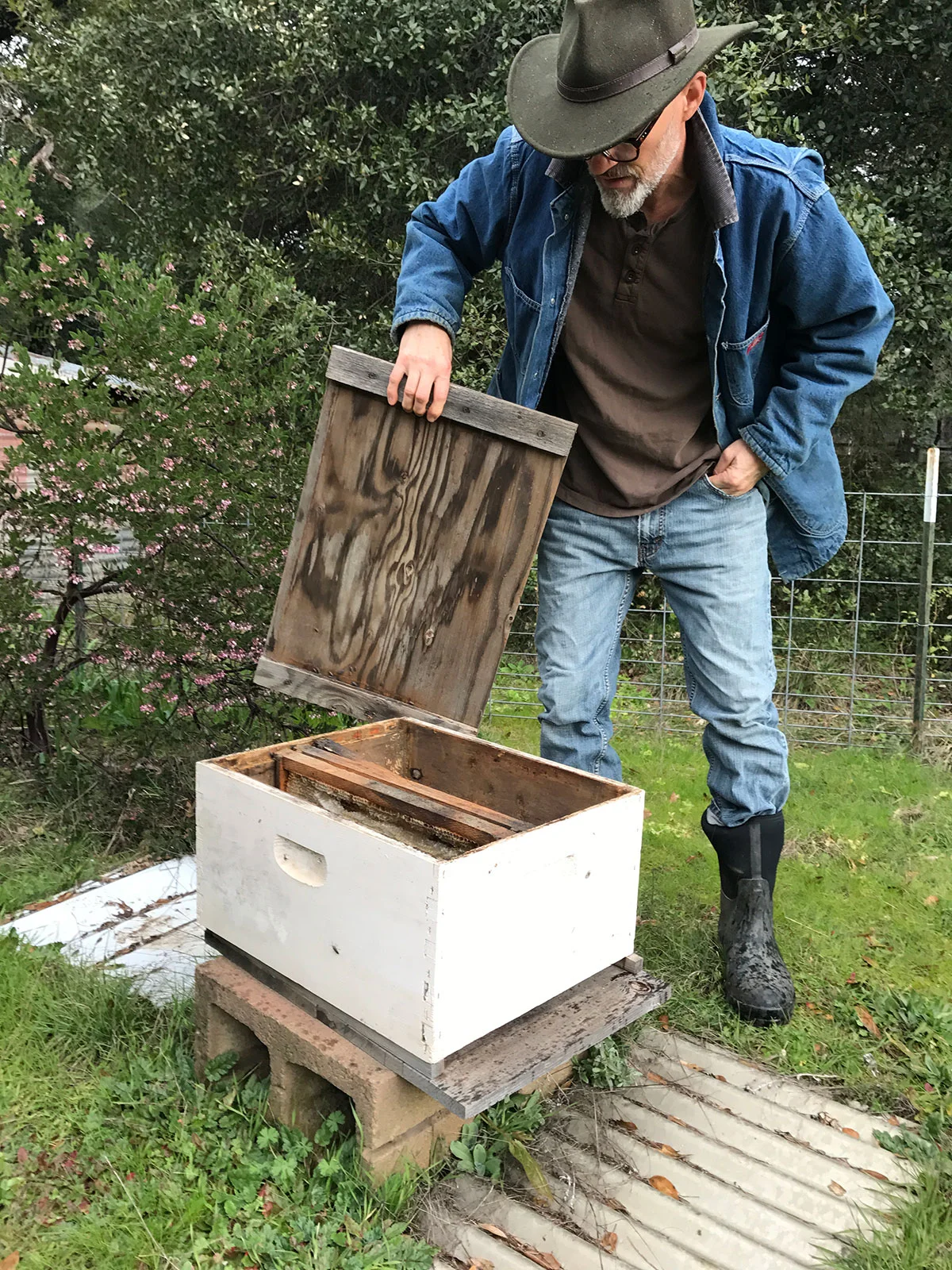 To be prepared, have on hand a “hospitable box,” says Darius. You can get a new bee box from your apiary supply source, or use an old one. It should be clean, with no mold, and a little bit of old wax from previous bees (you can add the old wax to a new box if that’s what you’re using). Situate the box on a raised platform to discourage ants, in a spot where it’s warmed by the morning sun, and provide a wind break behind it—a sheet of corrugated metal on two T-posts is an easy solution if you don’t have a tree line or other natural wind break. Most importantly, make sure there’s plenty of access to bloom and forage, and clean water as well. Hungry bees don’t stick around. Lastly, you’ll need the box frames in which the bees will store their honeycomb and honey.