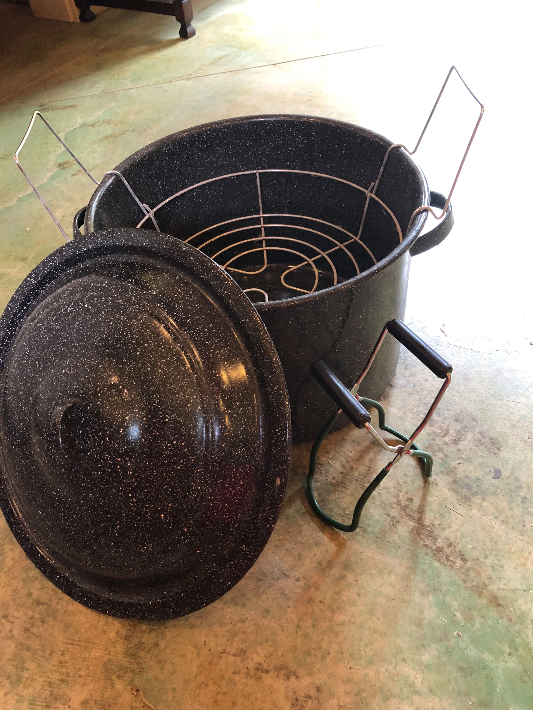 Canning pot with lid and rack; jar grippers.