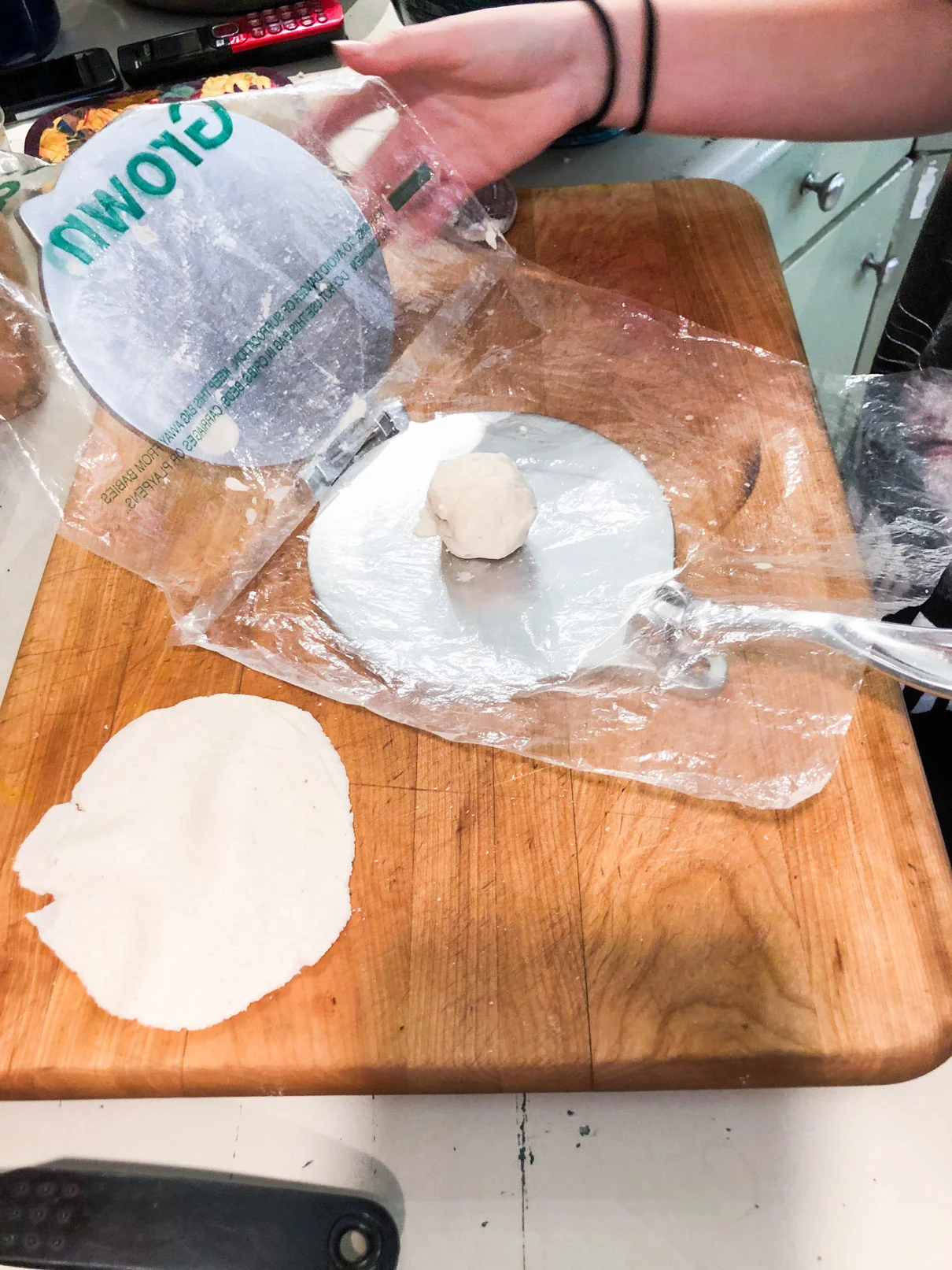 Take the tortilla press, lay half the plastic open across the press, place a ball of dough in the center, fold over the other half of plastic, close the tortilla press, and apply pressure until dough is flat. Remove the flattened tortilla from the plastic and place on the griddle. Flip once and cook until just before browning. Remove from heat to a cloth-lined basket, wrap and cover as you work. The tortillas will continue to steam in the cloth wrapping until you are ready to eat.