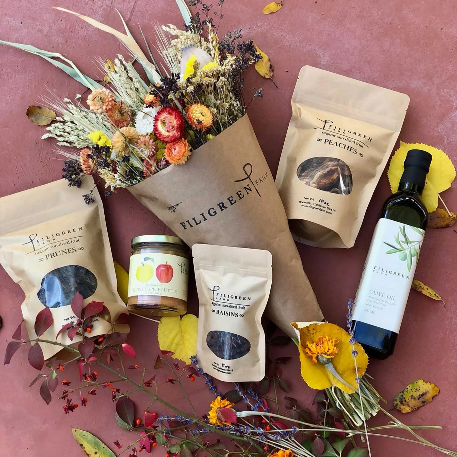 Filigreen Farm in Anderson Valley has gathered a selection of the season’s bounty into a gift tote for your friends and family. The tote includes a 500ml bottle of olive oil, dried fruit (peaches, prunes, and raisins), an everlasting bouquet, and quince apple butter. All items are Demeter certified Biodynamic, CCOF certified organic, and all grown and produced at Filigreen Farm.