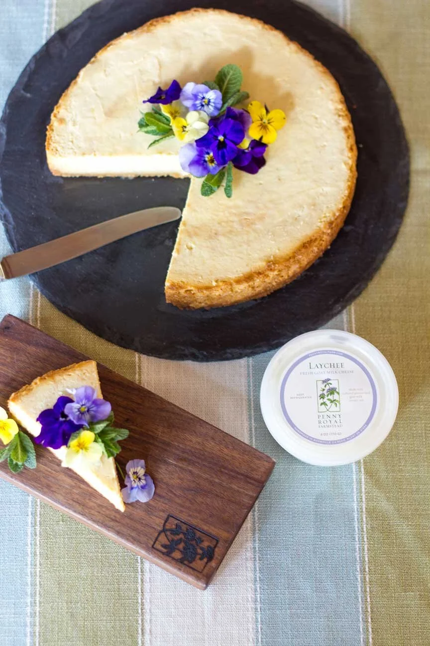 Other Pennyroyal cheeses take longer to mature. Bollie’s Mollies requires four weeks, while harder aged cheeses like Boont Corners, Fratty Corners, and Boonter’s Blue can take two months or more. Laychee, in contrast, is fast and fresh, the perfect spring cheese. Spread it on a slice of fresh bread with chutney, mix it into a creamy salad dressing, or go all out with Erika’s favorite Laychee Cheesecake for the perfect celebration dessert. Its creamy-sweet decadence embodies the jubilation that comes from being alive while the world shakes off winter’s frost and starts pushing green things up from the dirt under the welcome spring sun.