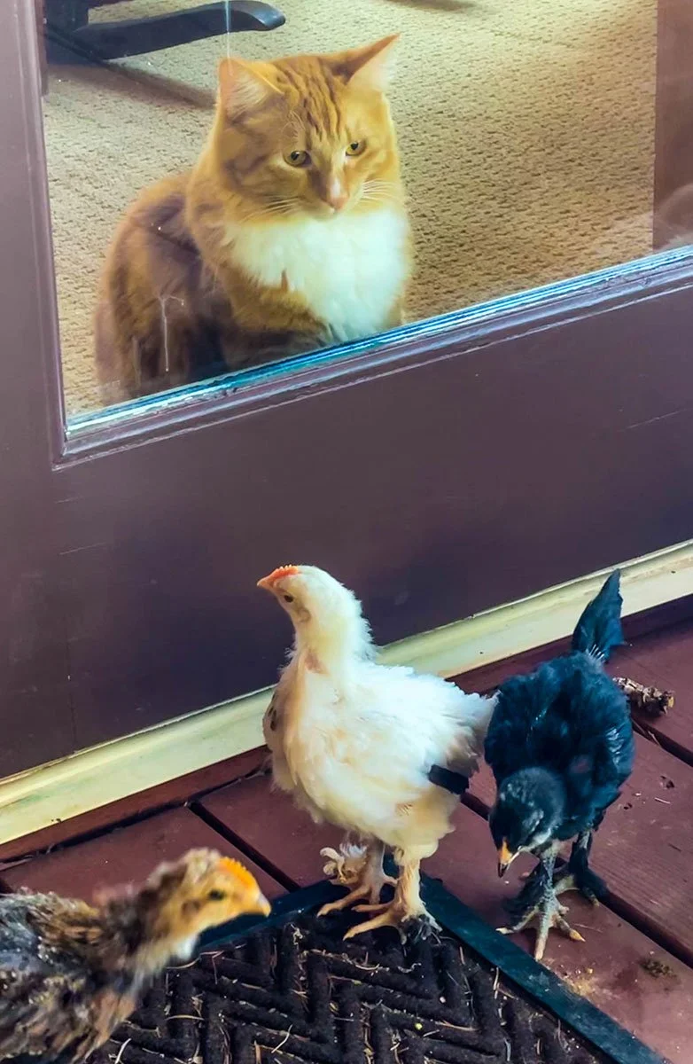 After a few hours, they were walking around and seemed to enjoy their new space. They were considerably bigger now, and they looked a bit scraggly as their full feathers continued to grow in. As they became more comfortable, they began to test out their wings and fly onto various low surfaces. (Though chickens can’t fly like other birds, they can fly for short distances.) At this age, they are almost continuously eating and growing, so they poop a lot. Everything was now a target for becoming a perch and getting pooped on, so I made sure to remove anything that we valued off of the porch. I made sure to clean the porch thoroughly at least once a week, which meant changing the hay, scrubbing the food and water containers out, and getting the dried poop off of any surfaces. It took a while, but it was important because chickens can get stinky very quickly, and they were so close to the house. I did my best to minimize the stink, but of course there was still some smell—that’s just what happens when you have chickens.