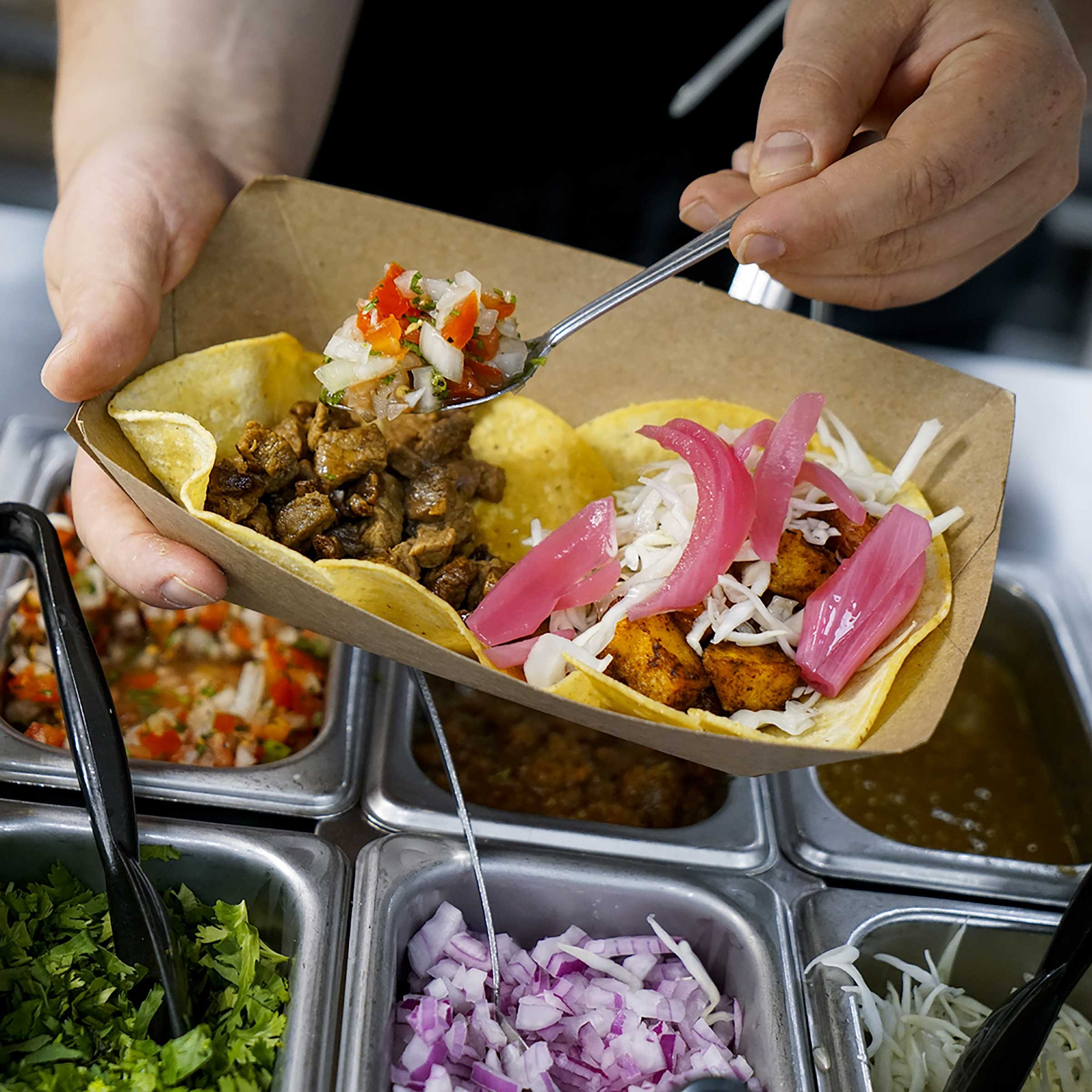 While coworkers benefit from Phil’s accumulated wisdom, customers get to romp around in the field of flavors he provides. The salad bar and the burrito/taco bar allow them to assemble their own meals. Burrito eaters can select a variety of animal proteins or chickpea fritter with Mexican spices, a creative take on the typically Middle Eastern falafel.