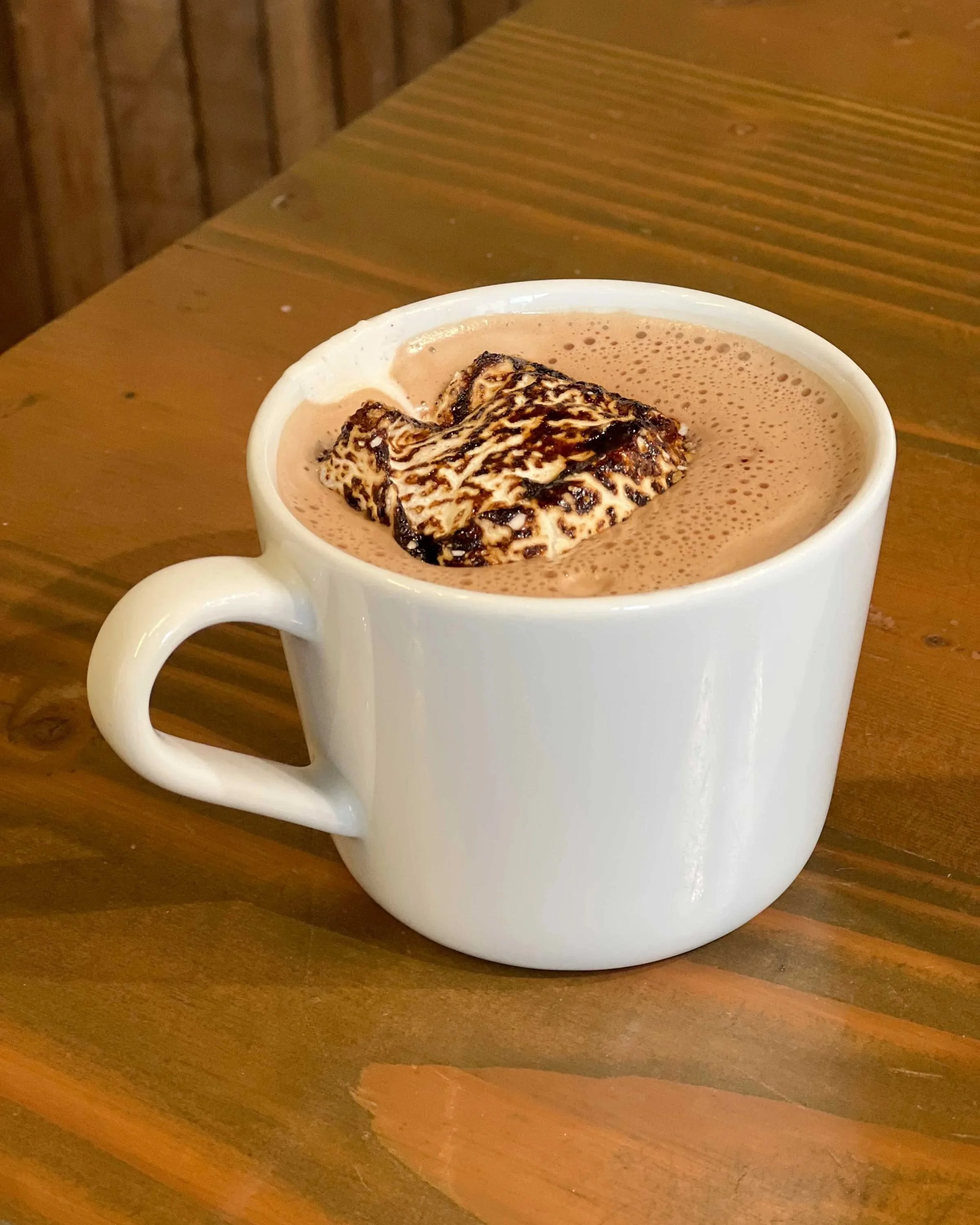 Surprisingly, my cup of “Campfire Hot Chocolate” with house-made smoked pecan syrup and a roasted marshmallow on top, is not too sweet. The hint of bitterness balances perfectly with the richness of the cocoa. This could not be confused with Swiss Miss. My tastebuds are working overtime to deciper this deeply flavorful experience.