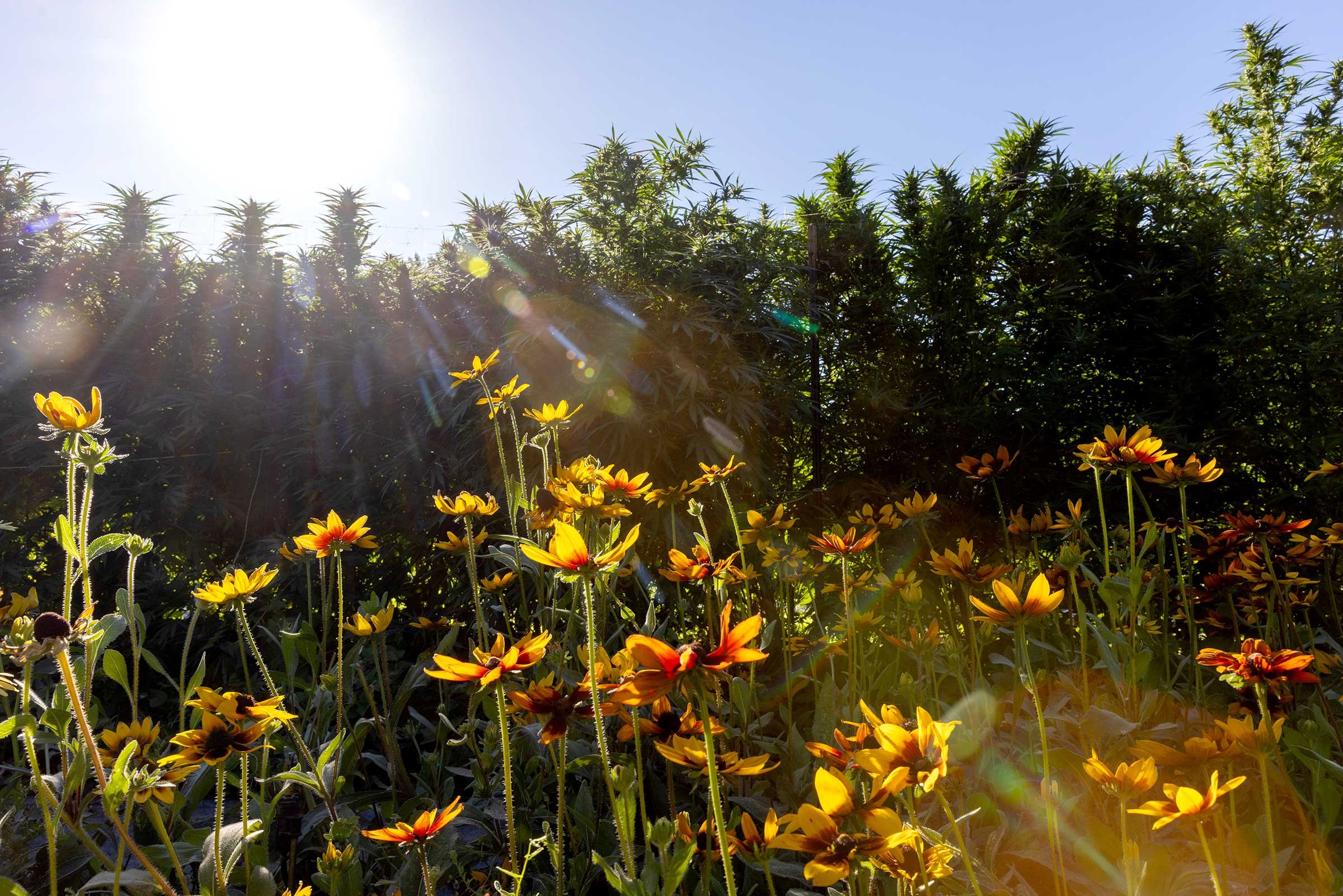 A host of herbs and flowers are grown among the cannabis plants, including nettle, comfrey, calendula, and lemon balm. A few times a year they cut those down and leave them on the ground to decompose into the soil. In fall they add 1 foot of oak leaves and the alfalfa. In spring they muck out the barns and add the hay/manure mixture on top of the raised beds. With this approach their soil quality and by extension the quality of their crop has been increasing year over year.