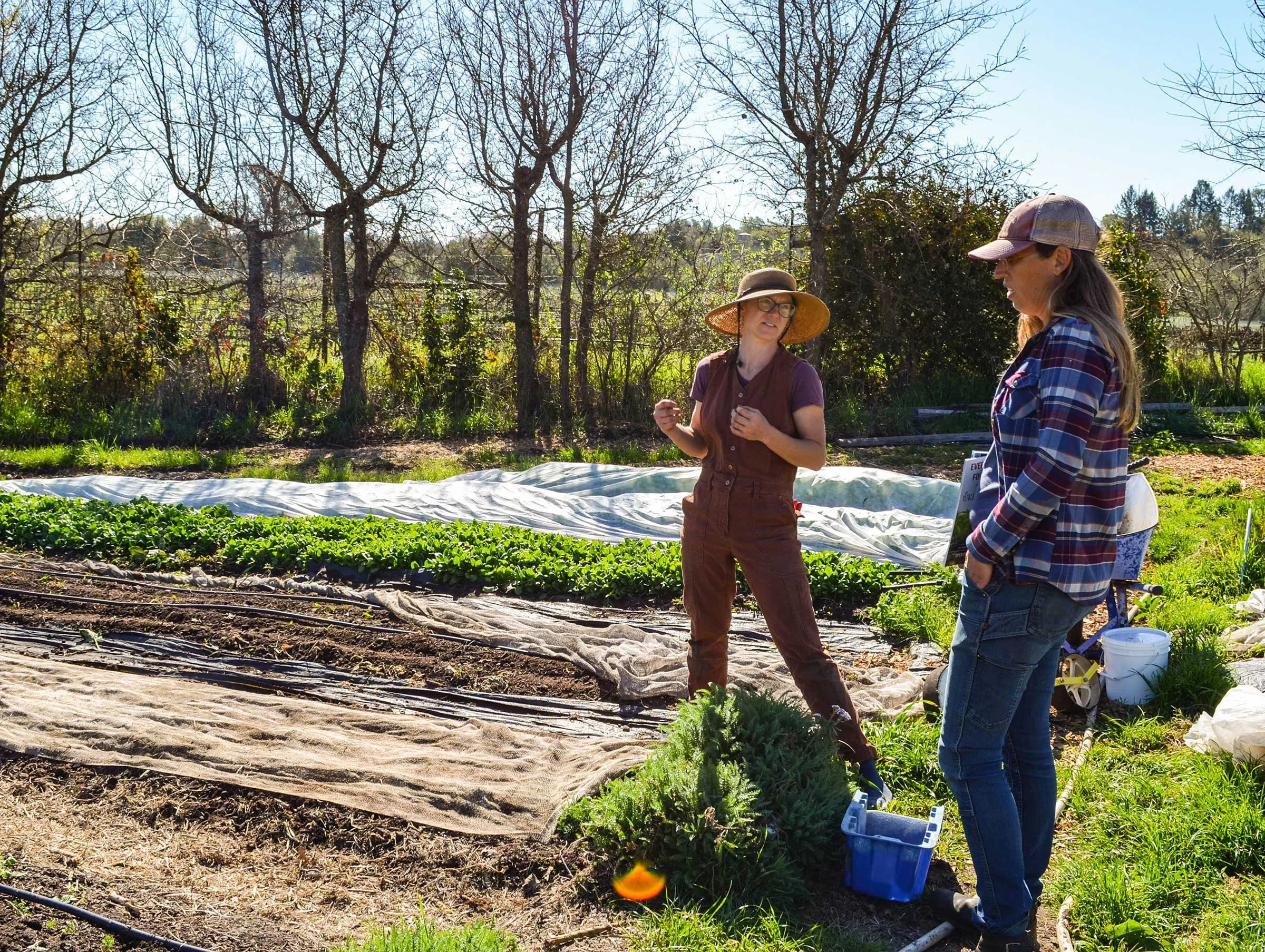 Another essential component of the no-till methodology is biodiversity. Planting a diverse mix of species keeps the pests guessing, and welcoming animals onto the property, both wild and domestic, provides natural pest control. In addition, multi-cropping in the same beds adds health and resilience to both the crops and soil while reducing watering, wind and sun stress, and weed management. Hedgerows, which Elizabeth calls “biological infrastructure,” protect the plant rows from wind and frost, stabilize field temperatures, and create healthier microclimates for crop growth. Hedgerows also host all manner of critters, from owls and snakes who hunt rodents to bees and other pollinators. She understands how beginning farmers, faced with their endless to-do list, can be tempted to postpone hedgerow planting. But the bushes and trees take time to mature, particularly in a temperate zone, and since the hedgerows play an essential role in the land’s biodiversity, crop health, and farm productivity, she recommends planting them as early as possible.